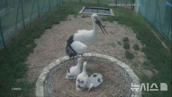 뉴시스 보도에 따르면, 지난달 28일 첫 부화 성공한 아기 황새는 잘 자라고 있다.