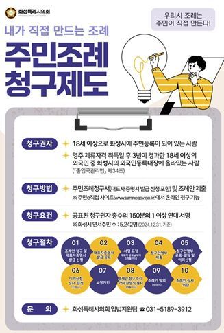 화성특례시의회에 따르면 주민등록이 되어 있는 18세 이상 화성시 주민으로, 선거권이 없는 자를 제외한 청구권자가 전체 주민 수의 150분의 1 이상인 5,242명(2024.12.31.기준)의 연대 서명을 통해 주민e직접 사이트에서 온라인으로 조례 청구가 가능하다고 밝혔다.