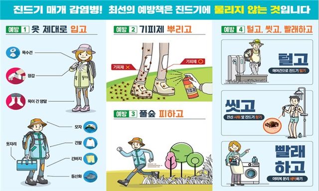 진드기 매개 감염병을 예방하기 위해서는 야외활동 시, 긴 옷과 팔토시, 장화 등을 착용해 피부 노출을 최소화하고, 작업 중 3~4시간마다 기피제를 뿌려야 한다. 특히, 풀밭에 앉거나 눕지 않고 귀가 즉시 옷을 세탁하고 목욕을 하는 등 예방수칙을 준수하는 것이 중요하다.