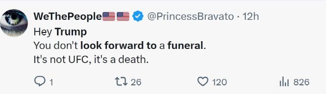 X 등 SNS에는 “기대되는 장례식이 세상에 어디있나?”, “멍청하다”, “사악하다” 등 트럼프가 쓴 표현에 문제를 지적하는 글들이 넘쳐났다. 1주 전 트럼프가 종합격투기 UFC 경기를 보러 간 것을 겨냥해 “UFC 보러 가는게 아니다. 이건 죽음에 대한 것”이라며 조롱하는 글도 보였다.