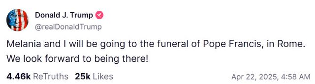트럼프는 21일(현지시간) 소셜미디어 ‘트루스’ 자신의 계정에 “멜라니아와 로마에서 열리는 프란치스코 교황 장례식에 갈 예정이다. 거기 갈 것이 기대된다!”는 짧은 메시지를 올렸다.
