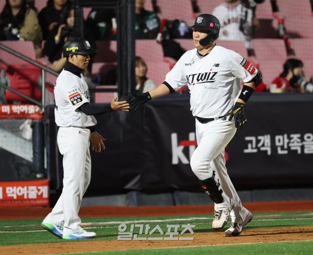 KT는 오히려 8회 말 추가 득점을 올리며 쐐기를 박았다. 선두타자 로하스의 볼넷과 김민혁의 안타, 대주자 최성민의 도루로 무사 2, 3루를 만든 KT는 권동진의 2타점 적시 2루타로 7-2까지 점수를 벌렸다. 여기에 장성우가 2점포를 쏘아 올렸다.