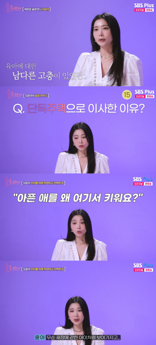 이날 오윤아는 경기도에 있는 단독 주택에 거주하게 된 이유를 밝혔다. 발달장애를 앓고 있는 아들을 키우기 위해 어쩔 수 없이 단독 주택을 선택하게 됐다고.