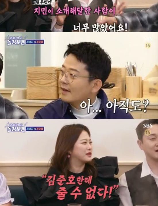 또 이상민은 김원효에게 "원효 씨가 지민이한테 남자를 많이 소개해줬다는데?"라고 물었고, 김원효는 "제 주변에 지민이를 소개해달라는 사람이 너무 많았다. 아직도 많다. (결혼) 기사가 났는데도 소개를 해달라고 한다"고 말해 김준호를 당황시켰다.