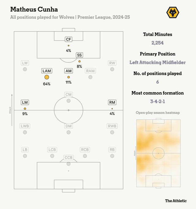 그러면서 "쿠냐가 아모림의 3-4-2-1 전형에서 2선 공격형 미드필더 중 한 명에 이상적인 보강으로 보이고 있다. 올 시즌 공식전 16골로 울버햄튼 최다 득점자인 쿠냐는 현재 비토르 페레이라 감독 체제에서 비슷한 시스템에서 뛰고 있다"고 덧붙였다.