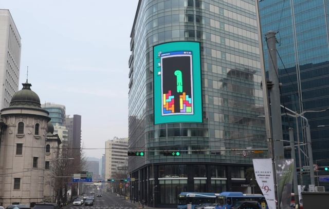 명동 K파이낸스빌딩 세로형 미디어에는 IP 브랜드 조구만 스튜디오와 협업해 추억의 게임 테트리스를 감각적으로 형상화한 '테트리스'를 선보였다. '테트리스' 콘텐츠는 송출되는 명동 K파이낸스빌딩 세로형 미디어의 특성을 살려 추억의 게임 ‘테트리스’를 감각적으로 형상화한 것이 특징이다.