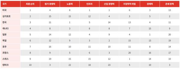 이 밖에도 1위를 차지한 미국의 항공방위 산업은 인프라와 산업 부문에서 우수한 성과가 두드러졌으며, 2위 싱가포르는 정부의 전략적인 인프라 투자를 통해 항공 산업의 성장동력을 꾸준히 확보해 나가고 있다고 평가했다.