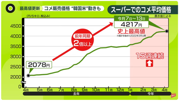 슈퍼에서 평균 쌀 가격_15주 연속 상승/니혼 TV 캡쳐(포인트경제)