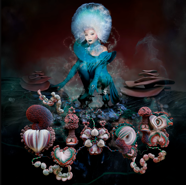 사진가 닉 나이트의 사진집 커버로 알려진 데본 아오키의 몽환적인 비주얼은 비요크의 〈Homogenic〉 앨범을 오마쥬 한 것으로 유명합니다. 푸른 매화꽃이 가득한 맥퀸의 동양적 가운과 숀 린이 제작한 티베트 전통 악세서리에서 영감받은 넥 피스는 당시 굉장한 화제를 불러일으켰습니다. 그리고 비요크의 바이닐 커버와 관련해 여러분이 기억할 만한 점 하나 더! 2022년에 발매한 〈Fossora〉 앨범 커버 속 룩은 한국 디자이너 지수백의 의상이라고 하네요.