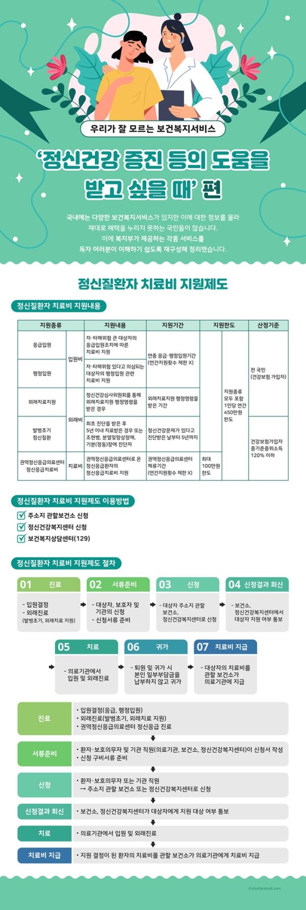 지난 ‘치료가 어려운 질환을 앓고 있을 때’ 편에 이어 ‘정신건강 증진 등의 도움을 받고 싶을 때’ 편을 통해 각종 지원제도를 소개합니다. 네 번째 순서는 ‘정신질환자 치료비 지원제도’입니다. 이는 정신질환으로 인해 치료가 필요한 자에게 정신과 치료비를 지원하고 사례관리를 하는 제도입니다. 지원종류에는 ▲응급·행정입원 ▲발병초기 정신질환 ▲외래치료지원 ▲권역정신응급의료센터 정신응급치료비 등이 있습니다.