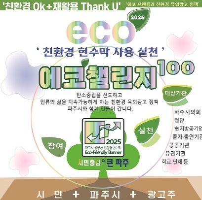 ‘에코챌린지 100’은 파주시가 기관, 학교, 단체들을 설득하고 동의를 얻어 탄소중립과 환경보전을 위한 친환경 현수막 사용 실천과 환경문제에 적극 참여하겠다는 의지를 담은 ‘참여 의향서’에 서명 후 시민들에게 공개하는 방식으로 진행될 예정이다.