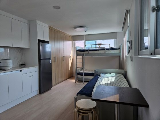 이데일리가 지난 21일 현장을 찾았을 때 외관은 신축 빌라나 펜션을 방불케 했다. 커뮤니티 시설이 있는 2동 실내로 들어가보니 공용 주방 공간이 있었고 사람들이 모여 앉아 차를 마시며 담소를 나누거나 식사를 할 수 있는 테이블과 의자도 있었다. 5개의 숙소 안에는 2층 침대와 욕실이 마련돼 있었다. 이곳은 단기(6개월 이하) 근로자나 근로자 가족들이 머무를 수 있는 공간이다. 1동 숙소는 3인 1실로 2층 침대에 1인용 침대 하나가 더 있었다. 이곳에는 1년간 머무르는 외국인 근로자가 사용하고 있었다.