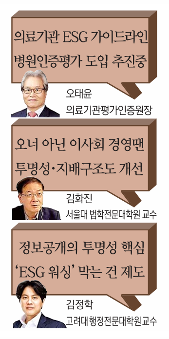ESG는 기준이 모호해 의료기관 도입이 어렵다는 지적이지만 G는 얘기가 다르다. 이미 많은 연구와 실무를 통해 객관적 지표가 마련됐기 때문. 오태윤 의료기관평가인증원장, 김화진 서울대 법학대학원 교수, 김정학 고려대 행정전문대학원 교수(한국ESG협회 이사장)에게 자세한 얘기를 들었다.