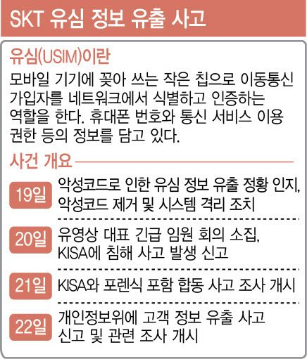SK텔레콤은 지난 19일 11시경 악성코드로 인해 고객의 유심 관련 일부 정보가 유출된 것으로 의심되는 정황을 발견하고, 내부 시스템에서 해커가 심은 것으로 추정되는 악성코드를 삭제·시스템 격리 조치를 실시했다.