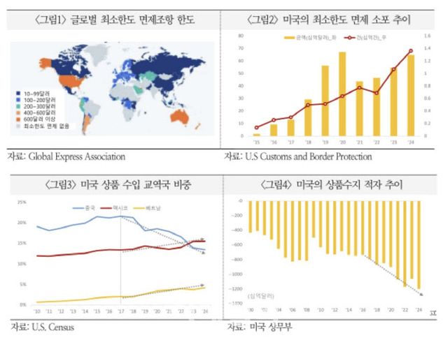 강 부전문위원은 “예정대로 최소한도 면제 조항이 폐지된다면 해당 제도를 이용 중인 직간접 경로는 모두 대규모 관세 부과 대상이 되면서 이 방식의 수출은 큰 폭으로 감소할 것”이라며 “생산시설을 멕시코나 동남아도 이전할 여력이 부족한 중국 업체들은 불법 원산지 변경 유인이 커질 수 있다”고 봤다.