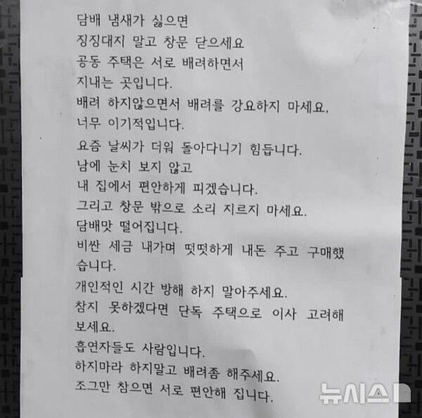 해당 편지에서 A씨는 "담배 냄새가 싫으면 징징대지 말고 창문 닫아라. 공동 주택은 서로 배려하면서 지내는 곳"이라며 "배려하지 않으면서 배려를 강요하지 말라. 너무 이기적"이라고 주장했다.