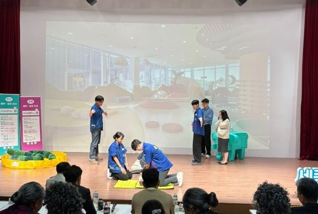 이들은 연극 형태로 심정지 상황 재연, 119신고 요청, 심폐소생술, 제세동기 사용 등을 제한 시간 8분 이내에 수행했다.