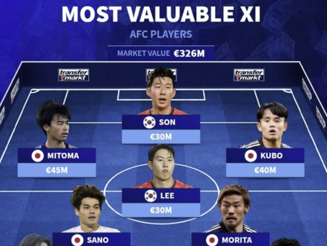 매체가 공개한 아시아 선수 가치 베스트 11에 한국 선수는 3명 있었다. 손흥민, 김민재, 이강인이다.