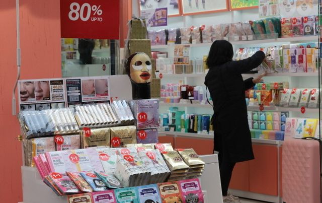 한 소비자가 다양한 마스크팩과 스킨케어 제품이 진열된 매장에서 제품을 살펴보고 있다. ⓒ연합뉴스