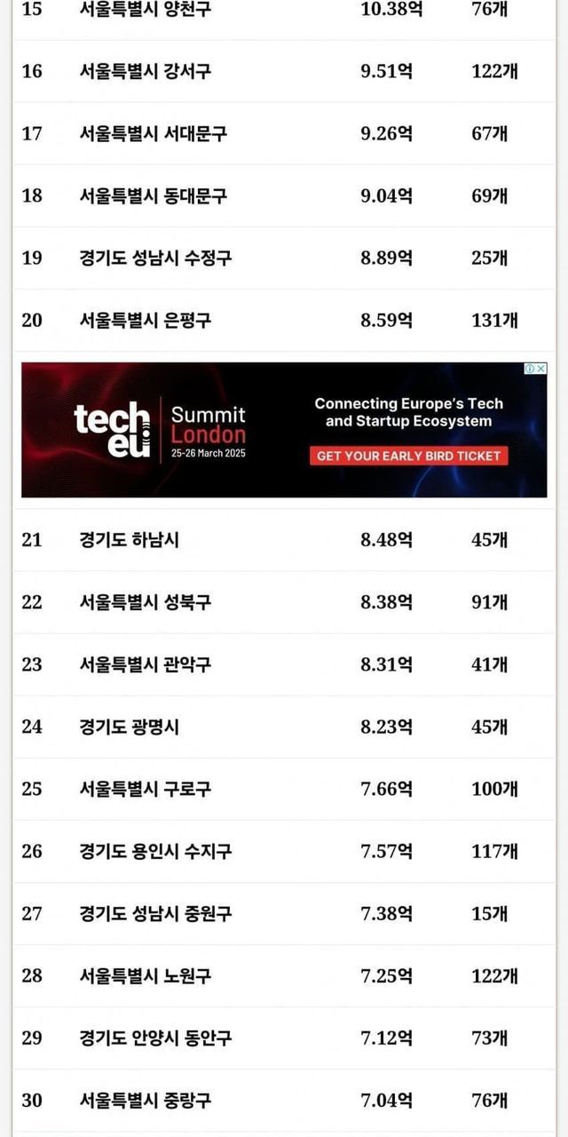 물론 대부분이 수도권이지만, 그외에도 부산, 대구, 대전, 울산 광역시들도 이름을 올렸다.