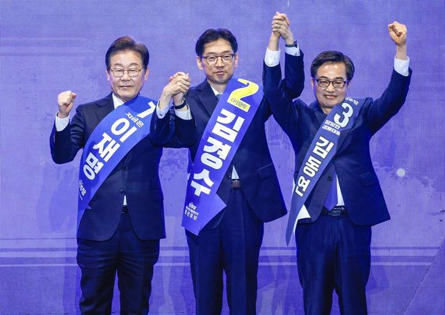 이재명(왼쪽부터), 김경수, 김동연 더불어민주당 대선 경선 후보가 지난 20일 오후 경남 울산전시컨벤션센터에서 열린 영남권 합동연설회에 참석해 정견발표에 앞서 기념 촬영하고 있다 / 뉴스1
