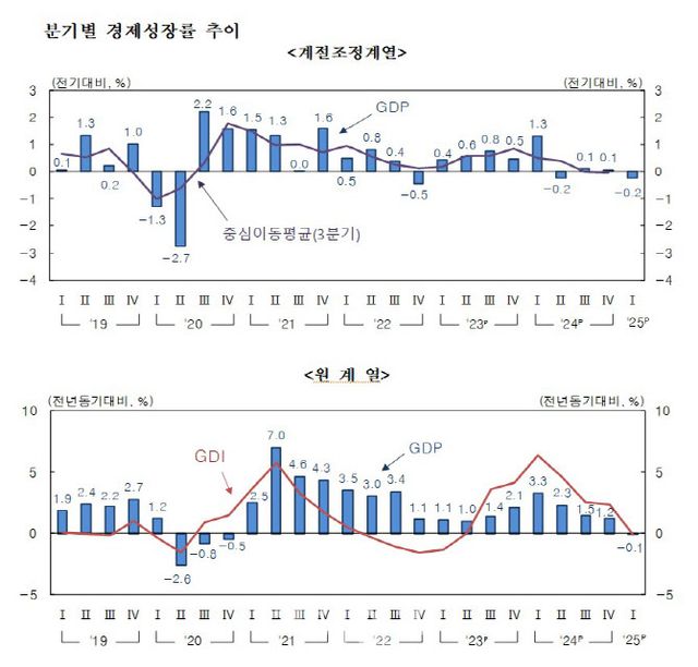 24일 한국은행이 발표한 올해 1분기 실질 국내총생산(GDP) 속보치에 따르면 지난 1~3월 전기비 성장률은 -0.2%를 기록했다. 지난해 2분기 이후 3개 분기 만에 역성장이며, 작년 3분기와 4분기 0.1% ‘찔끔’ 성장에 이은 부진한 성적표다.