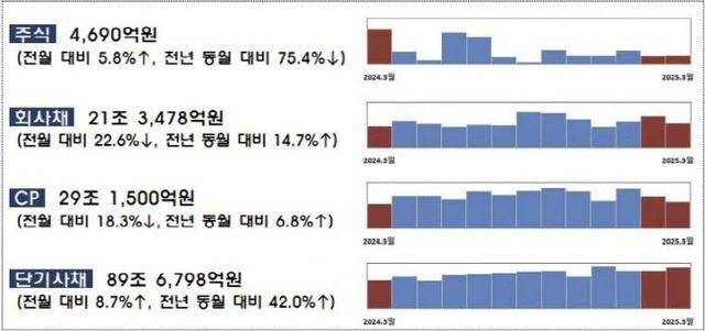 금융감독원은 24일 발표한 ‘2025년 3월 중 기업의 직접금융 조달실적’에 따르면 지난달 기업이 발행한 주식과 회사채는 21조8168억원으로 전월 대비 6조1898억원(22.1%) 감소했다.