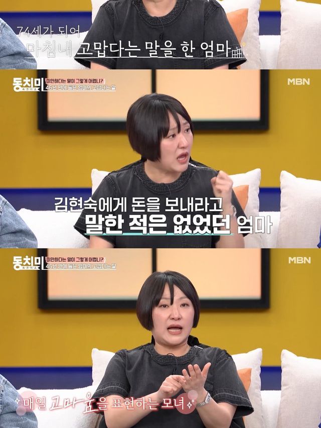 하지만 김현숙의 모친은 표현을 하지 않았다고. 김현숙은 "그런데 제가 아이를 낳고 엄마가 74살이 되시니 '나도 너한테 너무 고맙다' 이런 이야기를 했다"며 "저도 문제가 있었다. 가족들은 저에게 그렇게 하라고, '40만 원 남기고 나한테 다 보내' 이런 적 없었다. 제 스스로 그만큼 하고 고맙다는 이야기를 못들어 스스로 화난 거다. 나도 잘한 게 아니란 생각이다. 응어리가 지금 많이 풀어졌다"라고 이야기했다.
