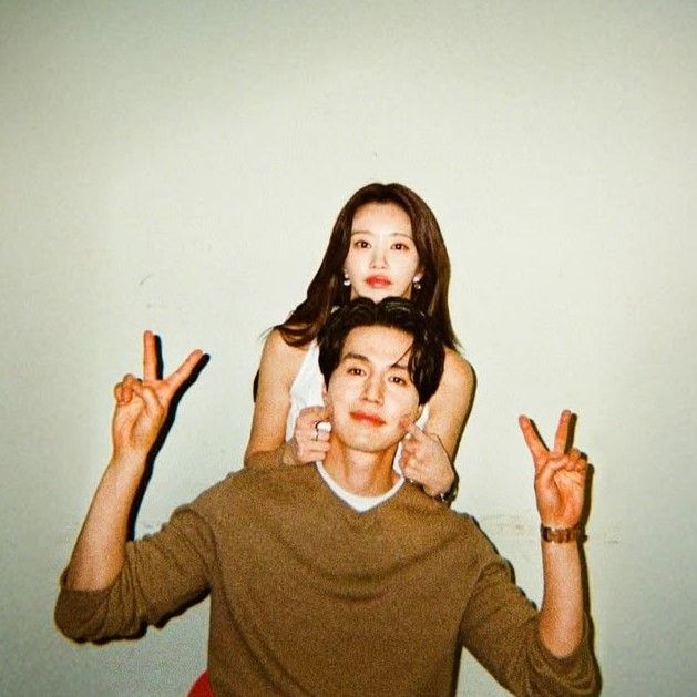 공개된 사진 속 이주빈은 이동욱의 뒤에 딱 붙어 그의 볼을 찌르고 있으며, 이동욱은 양손으로 브이 포즈를 취하고 있다.