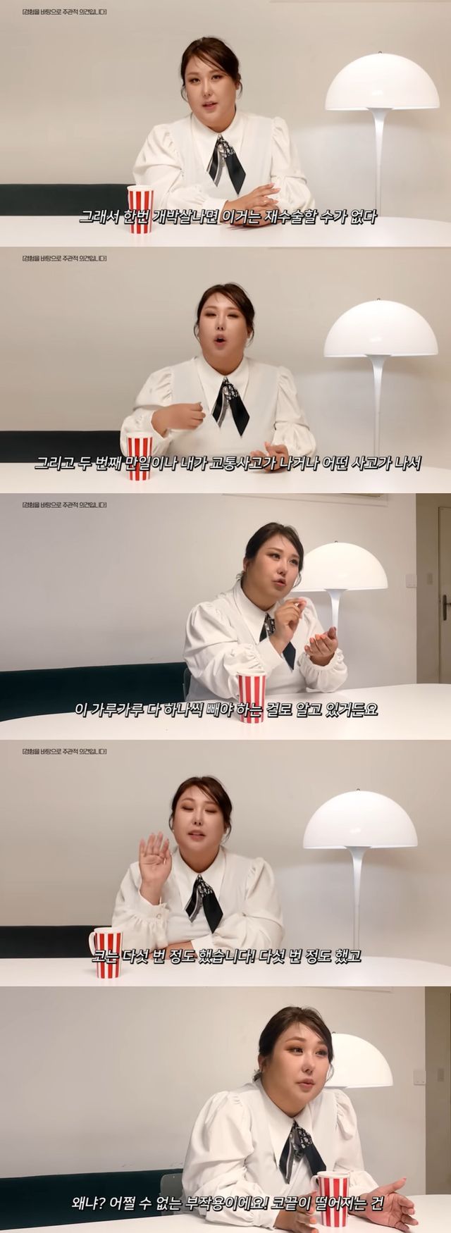 풍자는 이마 수술 후 물과 염증이 차는 고생을 하기 싫어 본시멘트로 진행을 했다며 "단점이 있다. 재수술이 너무 어렵다. 그리고 만약 내가 교통사고나 어떤 사고가 나서 보형물에 골절이 생기면 대형 수술이다. 제가 알기로는 본시멘트를 부숴서 가루가루를 다 하나씩 빼야 하는 걸로 알고 있다"고 설명했다.