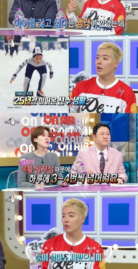 김구라는 "이상화 씨가 나이가 36살 정도 됐으면"이라며 말하자, 강남은 "저희도 아이 생각이 있었는데 상화 씨가 25년 동안 운동을 하다 보니까 몸이 많이 안 좋다. 무릎이랑 발목이 안 좋아서 3~4번씩 세게 넘어진다"라고 전했다.