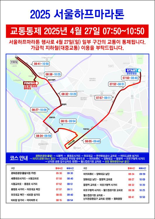 주요 통제구간은 △광화문광장 △세종대로 △시청 교차로△마포대교 △여의도 △양화대교 △합정역 △마포구청역 △상암 평화광장 등으로 구간별로 마라톤 통과 시간에 맞춰 약 1~2시간 통제된다.