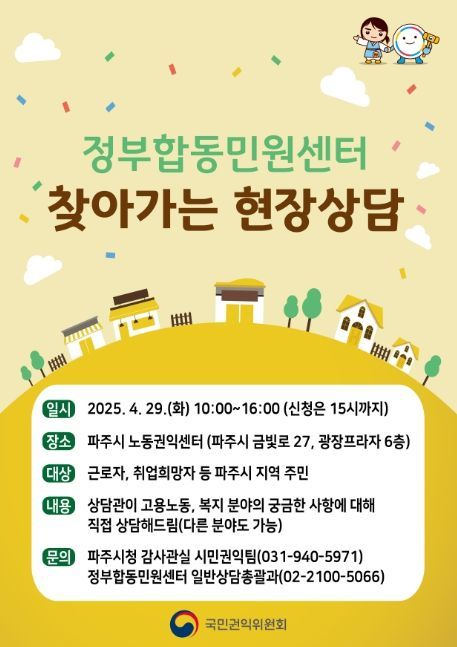 [와이뉴스] 국민권익위원회는 '근로자의 날'을 맞아 29일 파주시 노동권익센터에서 ‘찾아가는 현장 상담’ 창구를 운영한다.