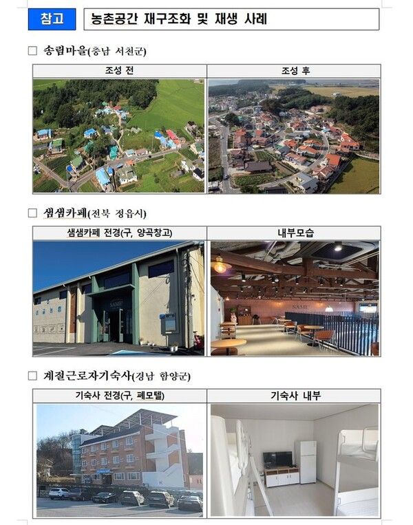김보람 농식품부 농촌공간계획과장은 "이번 사례집에 담긴 성공 경험들이 각 지역의 특성에 맞는 농촌공간계획 수립에 도움이 되기를 바란다"며 "앞으로도 창의적인 농촌 재생 사례를 지속적으로 발굴하고 소개할 계획"이라고 말했다.