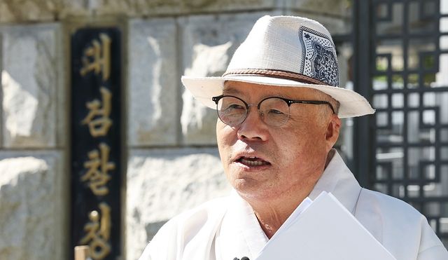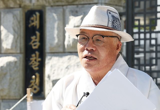 대검찰청 앞에서 기자회견을 하는 백은종 서울의소리 대표 모습. 기사 이해를 돕기 위한 자료 사진.서울남부지법 형사합의11부(장찬 부장판사)는 24일 특정범죄 가중처벌법상 보복협박 등의 혐의로 기소된 백은종 대표에게 "혐의가 합리적 의심의 여지 없이 충분히 증명됐다고 보기 어렵다"라며 무죄를 선고했다. 백 대표는 자신을 고소한 이에게 보복하겠다며 협박한 혐의로 재판에 넘겨졌다. / 연합뉴스