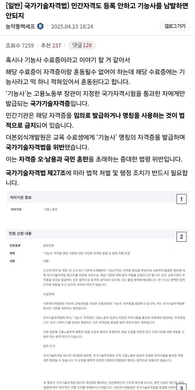 기능사라는 단어를 쓰면 안 되는 민간자격증을 기능사라는 이름을 달고 발급해줌(O)