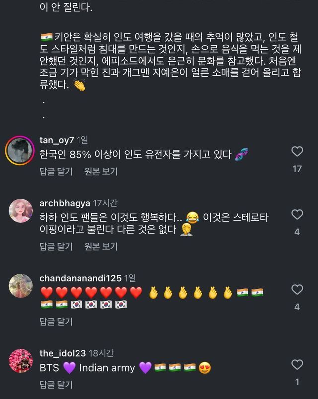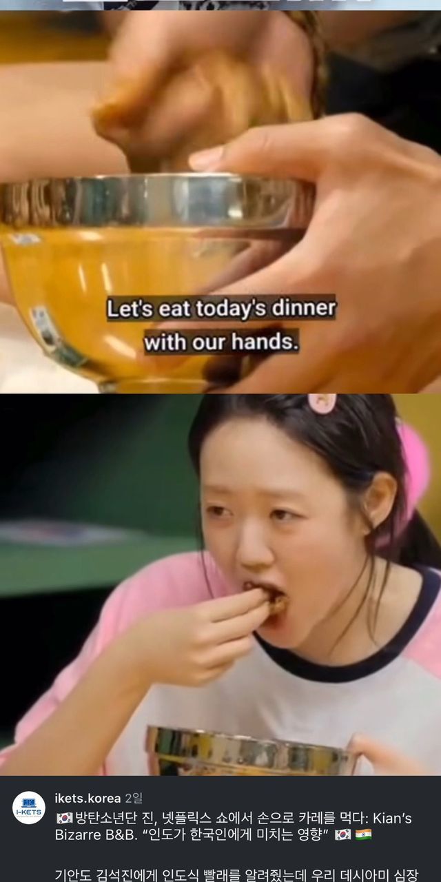 기안 예능에 방탄 진이 인도식으로 먹으니까 자랑스러워함