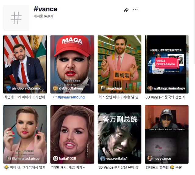 그런가 하면 틱톡에는 JD 밴스 부통령의 짙은 아이라인을 드래그퀸같다고 조롱하는 영상이 넘쳐나고 있다. 그는 ‘아이라이너맨’이라는 별칭도 얻었다.