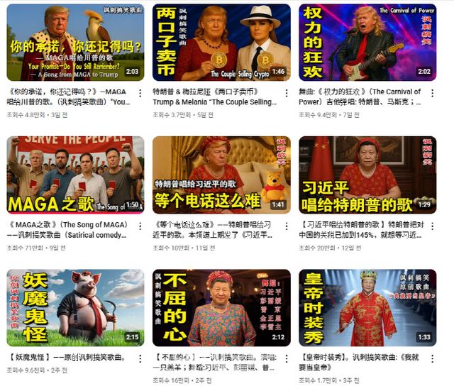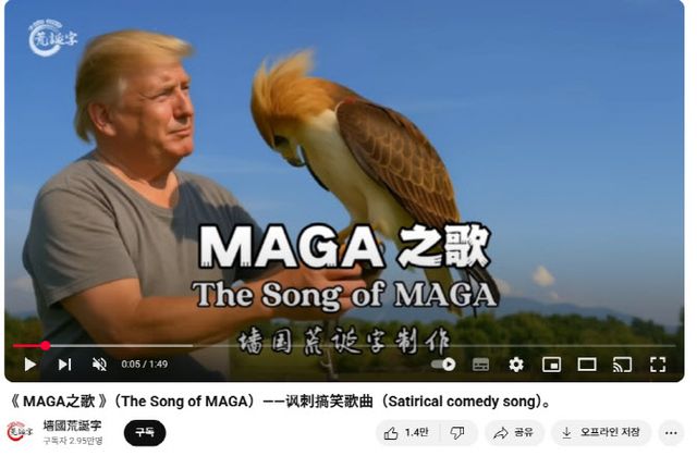 뉴욕타임즈(NYT)에 따르면 시진핑 중국 주석을 풍자하던 패러디 음악 영상을 제작하던 한 유튜버가 이번에는 트럼프 대통령을 주제로 한 ‘MAGA(Make America Great Again)의 노래’를 만들었다. ‘장국황탄자’라는 이름으로 검열과 통제가 심한 중국을 비꼬던 유튜버는 이전에는 시 주석을 풍자하는 영상을 주로 올렸으나 최근에는 트럼프 대통령으로 타깃을 바꿨다. 트럼프 대통령이 그리는 미국은 오토바이를 타고 다니는 미국인, 만두를 파는 마코 루비오 미국 국무장관 등 마치 중국을 연상케 한다. 미국이 중국을 닮아가고 있다는 것이다.