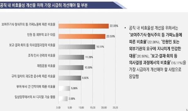조사 결과 응답자 22.06%는 공직 내 비효율성 개선을 위해 가장 시급히 개선해야 할 부분으로 '보여주기식·형식주의 등 가짜노동에 따른 비효율'을 지목했다.
