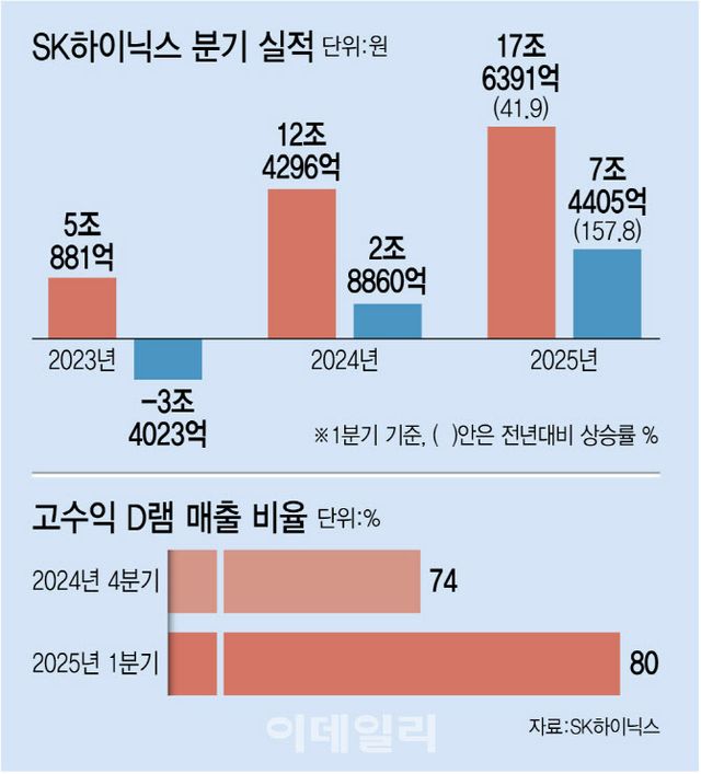 SK하이닉스의 호실적은 5세대 HBM3E와 더블데이트레이트5(DDR5) 등을 중심으로 D램 수익성이 개선된 영향이다. 특히 고수익 D램의 매출 비중은 직전 분기 74%에서 1분기 80%로 확대됐다. SK하이닉스 측은 “낸드플래시 가격 하락으로 매출이 감소하며 영업이익 규모도 전기 대비 소폭 줄었지만 수익성이 높은 D램의 영업이익률이 소폭 개선됐다”며 “전사 영업이익률도 전기 대비 개선됐다”고 밝혔다.