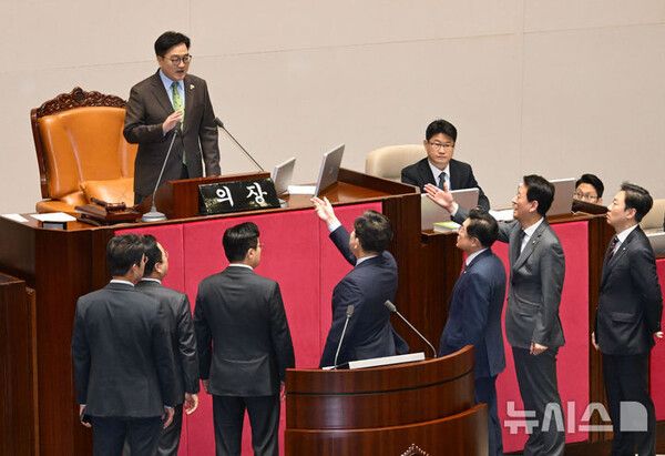 일부 국민의힘 의원들은 한 대행을 나무라는 우 의장의 발언에 "뭐라는거야"라고 소리질렀고 민주당 의원들은 "조용히 하라"고 맞받았다. 우 의장의 발언이 끝난 뒤에 박수를 보내는 민주당 의원들도 있었다.