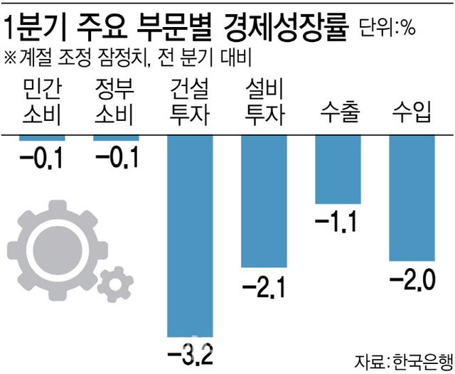 24일 한국은행에 따르면 올해 1분기 실질 GDP(속보치)는 전기대비 0.2% 감소했다. 지난해 2분기 이후 3개 분기 만에 역성장이며, 지난해 △2분기 -0.2% △3분기 0.1% △4분기 0.1%에 이어 4개 분기 연속 ‘바닥권’ 성장률을 기록했다.