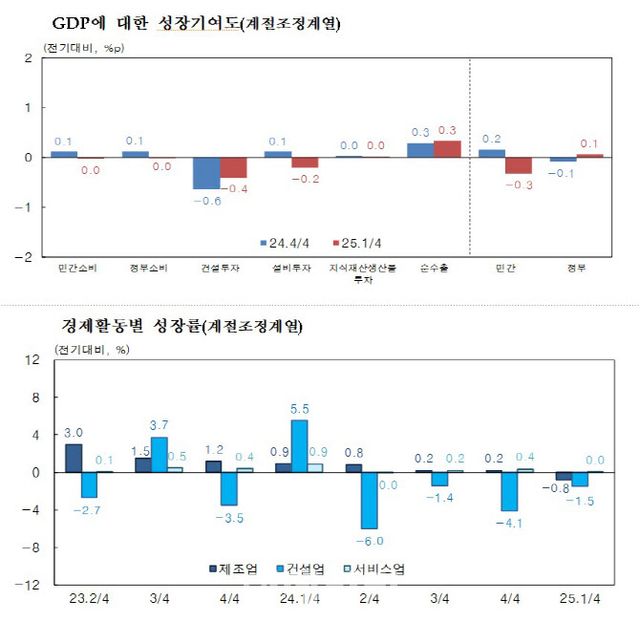 다만 시장에서는 2분기 이후 완만한 경기 반등 전망과 함께 내수 회복과 수출 타격에 따른 2분기 성장률 부진에 대한 우려 섞인 목소리가 함께 나왔다. 박상현 iM증권 연구위원은 “내수가 예상보다 더 안 좋았던 것 같다. 특히 건설투자쪽이 예상보다 좀 낮게 나왔다”며 “2분기도 역성장 그늘에서 벗어나긴 쉽지 않을 것 같다”고 진단했다. 이정훈 유진투자증권 연구원은 “내수 부진이 매우 심각한 상황”이라며 “4월 탄핵 선고에도 소비 심리가 소폭 개선에 그친 점을 볼 때 내수 반등은 6월 새 정부 출범 이후에나 조금 더 뚜렷해질 것”으로 봤다. 하건형 연구원은 “대외 여건이 빠르게 악화되고 있다”며 “트럼프 행정부는 시장 우려보다 광범위하고 높은 관세율을 부과했고, 불확실성에 따른 교역 둔화까지 감안하면 중간재 중심 한국 수출은 2분기 중 추가 감소가 불가피하다”고 지적했다.