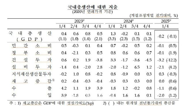 1분기 성장률이 한은이 지난 2월에 제시한 전망치(0.2%)를 밑돌 것은 이미 예고됐다. 한은 조사국은 지난 17일 금융통화위원회의 기준금리 결정 당시 발표한 4월 경제상황 평가를 통해 “올해 2월 전망 이후에도 예상치 못한 부정적인 충격들이 잇따라 발생하면서 1분기 성장세가 당초 예상보다 약화됐다”며, △국내 정치 불확실성의 장기화와 미 관세정책 우려에 따른 경제심리가 재위축 △대형 산불 △일부 건설 현장의 공사 중단 △고성능 반도체(HBM) 수요 이연 등을 악재로 들었다.
