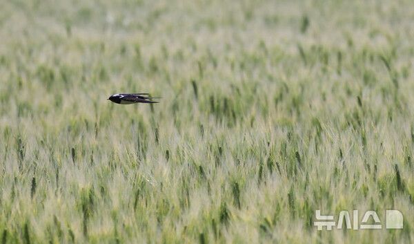 [서울=뉴시스] 맑은 날씨를 보인 24일 오전 제주시 내도동에서 제비가 보리밭 위를 가르며 먹이활동을 하고 있다.