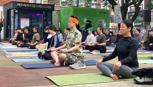 이날 오후 5시 제주시청 일대는 고요한 호흡으로 채워졌다. 시민들은 각자 챙겨온 매트를 펴고 요가 수련에 나섰다. '제주시청 일대에 모여 온 에너지를 모아 제2공항 반대 운동을 진행하겠다'는 이들은 이날 만큼은 목소리 대신 행동으로 뜻을 전했다. 바닥에 앉아 하늘을 향해 손을 뻗으면서 참가자들은 제주의 자연을 온몸으로 느꼈다.