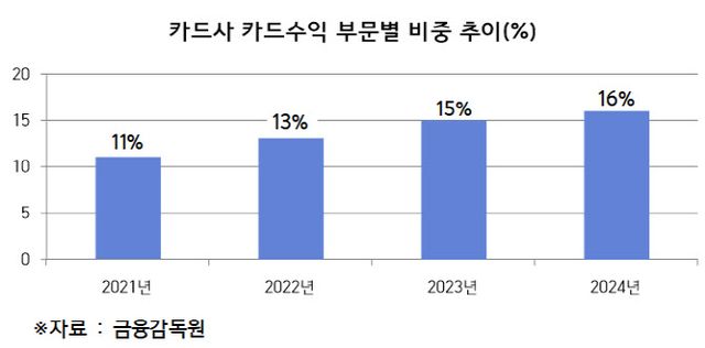 반면 같은 기간 본업인 가맹점 수수료 수익 비중은 41%에서 37%로 줄었다. 4.5%였던 가맹점 수술료율이 우대수수료율 기준 0.4~1.45%로 떨어진 영향이다. 2012년 도입된 ‘적격비용 제도’로 9조 2700억원(누적 기준) 효과가 발생했다. 이를 카드사들이 모두 떠안으면서 수익성이 악화했다.