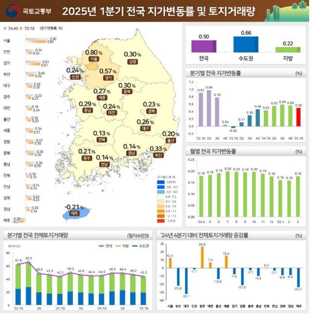 [와이뉴스] 국토교통부와 한국부동산원(원장 손태락)은 ’25년 1분기 지가변동률 및 토지거래량을 발표했다.