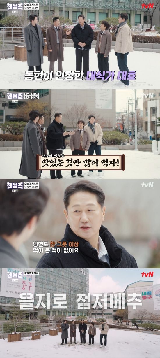 김동현은 "(보통) 맛있다는 폭이 그렇게 넓지 않다. 대호는 웬만한 거 다 맛있다고 한다. 싫어하는 거 뭐 있냐"라며 물었고, 이대호는 "국수 같은 거 잘 안 먹고. 라면은 두 봉지 정도. 냉면도 별로 좋아하지 않는다"라며 설명했다. 그러나 이대호는 삼겹살이 언급되자 "그건 무한대로 먹는다"라며 남다른 먹성을 자랑했다.